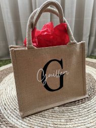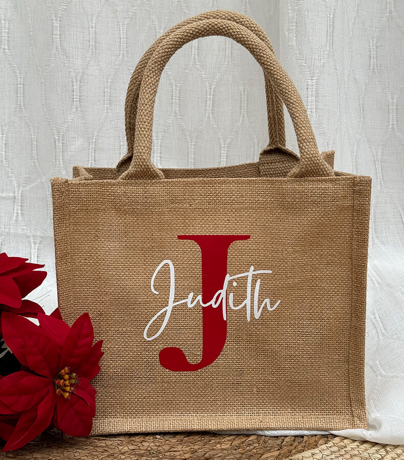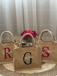 - Bolsa de yute con asas cortas para llevar en la mano.